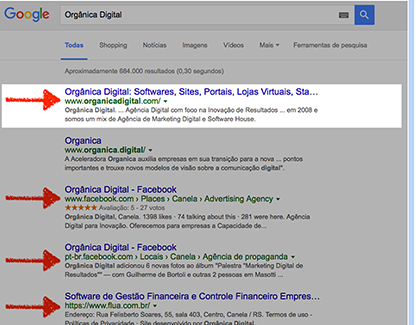 Observe que, dos primeiros 5 resultados, 4 são da Orgânica. O outro é de uma empresa de outro segmento de atuação que possui o mesmo nome, mas com muito menos autoridade do que nós para o termo.